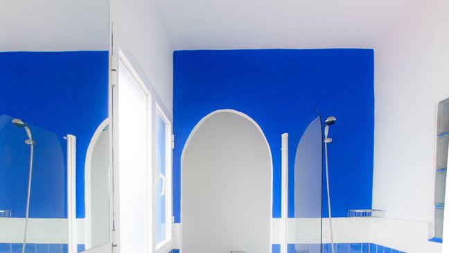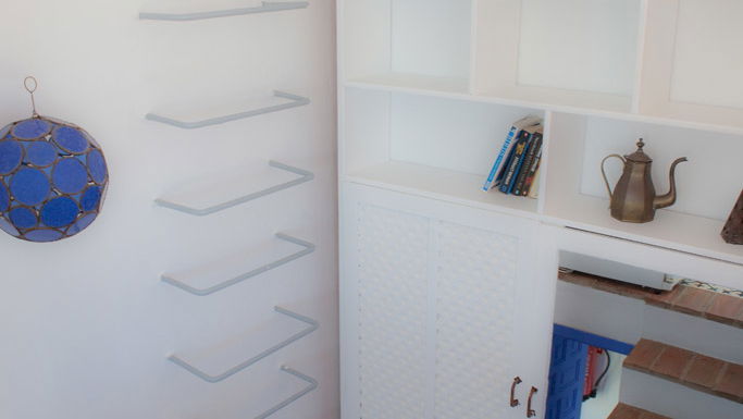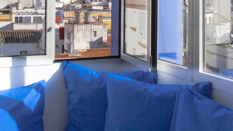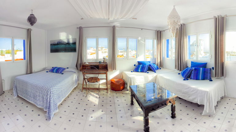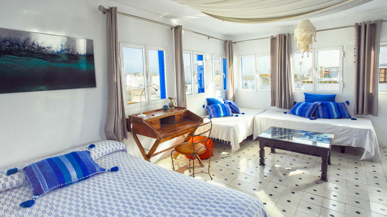 Todos los detalles de estilo y decoración que caracterizan nuestro hospedaje están patentes en nuestra Ático: 2 tipos de suelo hidráulico para diferenciar cada zona, ventanas climalit que te permiten disfrutar de las impresionantes vistas pero te aíslan de la climatología, lámparas de hierro forjado y cristales de color, apliques de hierro perforado, farolillos, teteras, pufs marroquíes de piel, espejos árabes, el omnipresente azul añil contrastado con el blanco encalado de nuestras paredes, tanto enmarcando los elementos separadores como en los azulejos con el que decoramos nuestros baños.