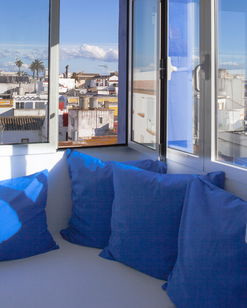 Todos los detalles de estilo y decoración que caracterizan nuestro hospedaje están patentes en nuestra Ático: 2 tipos de suelo hidráulico para diferenciar cada zona, ventanas climalit que te permiten disfrutar de las impresionantes vistas pero te aíslan de la climatología, lámparas de hierro forjado y cristales de color, apliques de hierro perforado, farolillos, teteras, pufs marroquíes de piel, espejos árabes, el omnipresente azul añil contrastado con el blanco encalado de nuestras paredes, tanto enmarcando los elementos separadores como en los azulejos con el que decoramos nuestros baños.