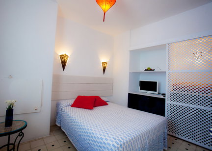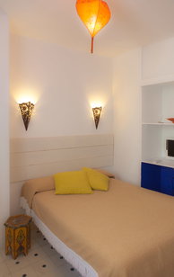 Elle dispose d'un grand lit avec une tête-de-lit en bois blanc, des appliques en fer forgé, une petite table arabe en mosaïque. Elle donne à l'extérieur sur la rue San Rosendo.
