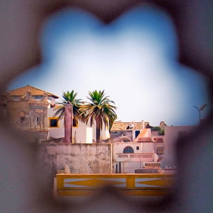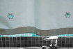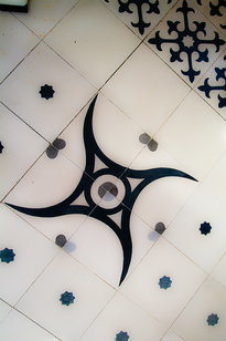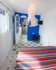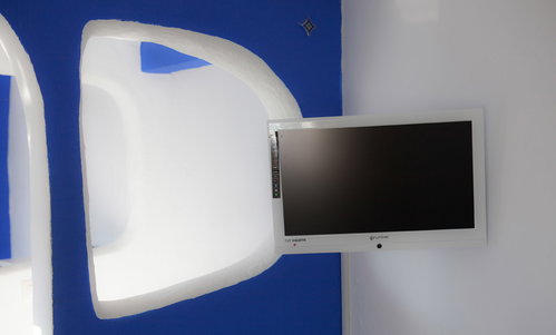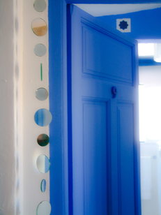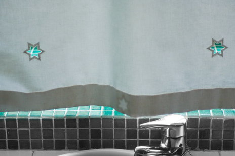 Cette chambre se trouve au 3ème étage. Son architecture aux formes douces et arrondies lui donne un charme spécial. Un mur vouté et un hublot séparent la chambre de la petite salle-de-bains avec douche. C'est une chambre romantique et gaie. Ses trois fenêtres l'inondent de lumière contrastant avec le bleu indigo des bordures.